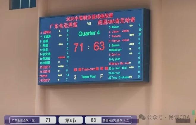 雖然對方在第二節(jié)比賽的進(jìn)攻狀態(tài)有所提升,不過廣東隊的進(jìn)攻依舊給力,單節(jié)打出了22-12的比分,將分差擴(kuò)大到20分以上。半場比賽結(jié)束,廣東隊以45-21領(lǐng)先。不過到了下半場比賽,場上卻風(fēng)云突變,廣東隊第三節(jié)比賽打得非常亂,單節(jié)只得到了8分。而肯尼哈奇卻連續(xù)打出攻防轉(zhuǎn)換,單節(jié)打出了23-8的比分,一舉將分差縮小到個位數(shù)。最后一節(jié)比賽,徐杰的三分球幫助球隊再次將優(yōu)勢擴(kuò)大到兩位數(shù),不過隨后球隊再次出現(xiàn)了進(jìn)攻斷電的情況,被對手再次將分差縮小到個位數(shù),最終以71-63的比分力克對手。