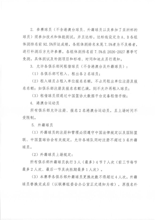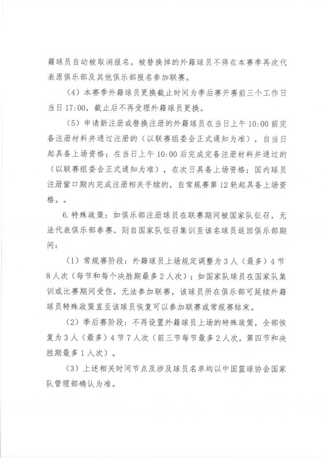 還有比較關(guān)注的外援政策,每支球隊(duì)允許同時(shí)注冊(cè)不超過(guò)3名外籍球員,上場(chǎng)則是4節(jié)7人次,前三節(jié)每節(jié)最多2人次、最后一節(jié)及決勝期最多1人次,至于更換次數(shù)不得超過(guò)4人次。