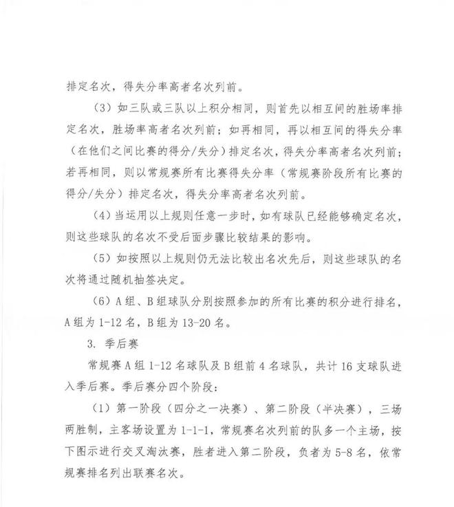 季后賽方面,常規(guī)賽A組1-12名球隊(duì)及B組前4名球隊(duì),共計(jì)16支球隊(duì)晉級(jí)。此處賽制有了不小變化,屆時(shí)季后賽八強(qiáng)直接由常規(guī)賽前八名獲得。