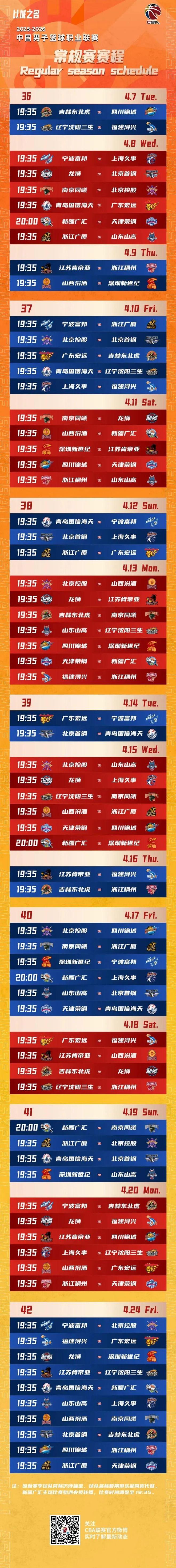 10月20日,CBA聯(lián)賽公布新賽季賽程,2025-2026賽季CBA聯(lián)賽常規(guī)賽將于12月12日開賽,次年4月24日收官,常規(guī)賽共42輪。