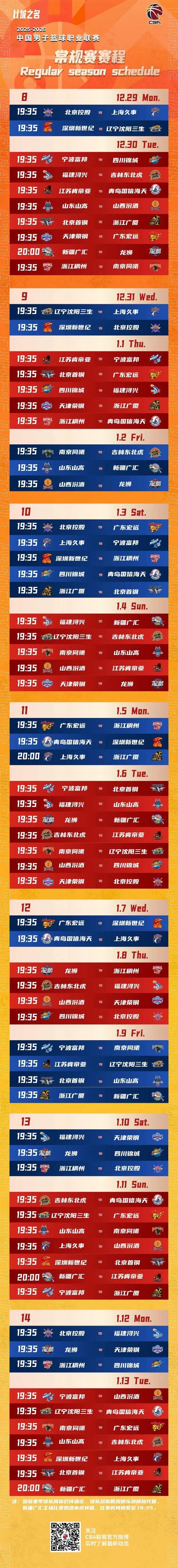 其中在12月13日,新疆男籃將在主場(chǎng)迎來(lái)首場(chǎng)比賽,對(duì)手是福建男籃。2026年4月24日,新疆男籃將在最后一輪比賽中將對(duì)陣青島男籃。